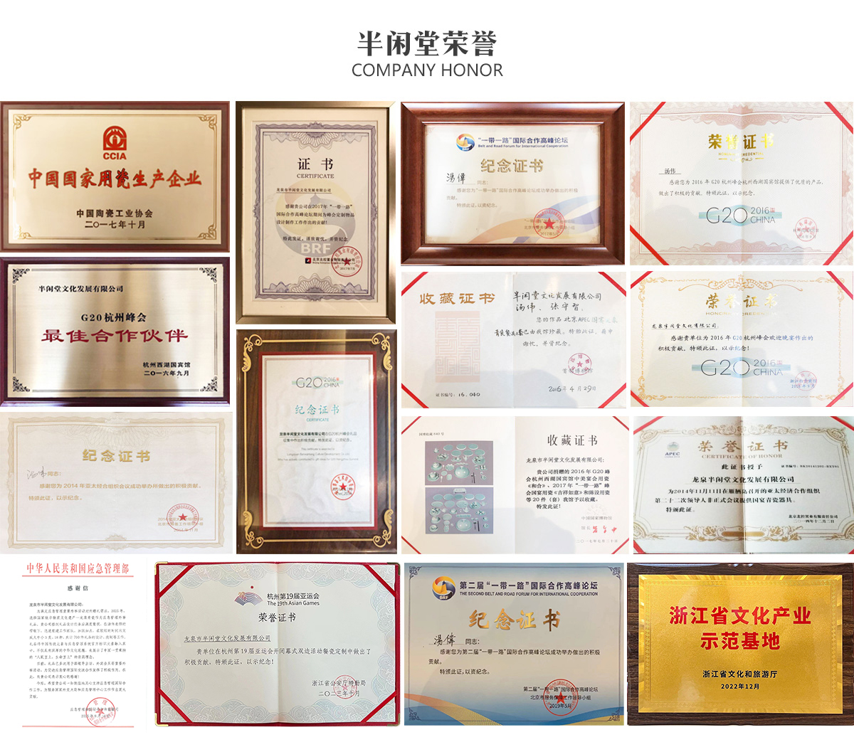 半闲堂国瓷团队始终坚守着“不计成本,不惜一切代价,以“100%原矿原料、100%纯手工、100%古法技艺”的工匠精神,不断刷新着青瓷制作技艺的新记录,其倾情奉献的国瓷国礼,一路从2014年APEC北京峰会到2016年G20杭州峰会,从2017年第一届、2019年第二届“一带一路”北京国际合作高峰论坛到杭州第19届亚运会。在这些重要的国际性会议上,『半闲堂』出品的龙泉青瓷,无论是一杯、一盏、一壶,还是一套碟盘,都有着温润流畅的线条,秀丽典雅的造型,通透晶莹的质感,给人以山水诗画的无限遐想。