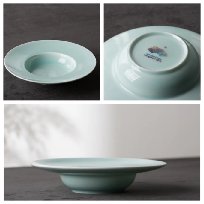 器型朴实无华,外沿宽而有度,拿取方便。清雅的釉色,有如千峰翠色,宁静深远,折射出悠然光晕,与浙江的青山绿水相互辉映。这是半闲堂·衢窑国瓷团队专为杭州第19届亚运会精心创作的《高节·国宴青瓷餐具》中的单品哦~